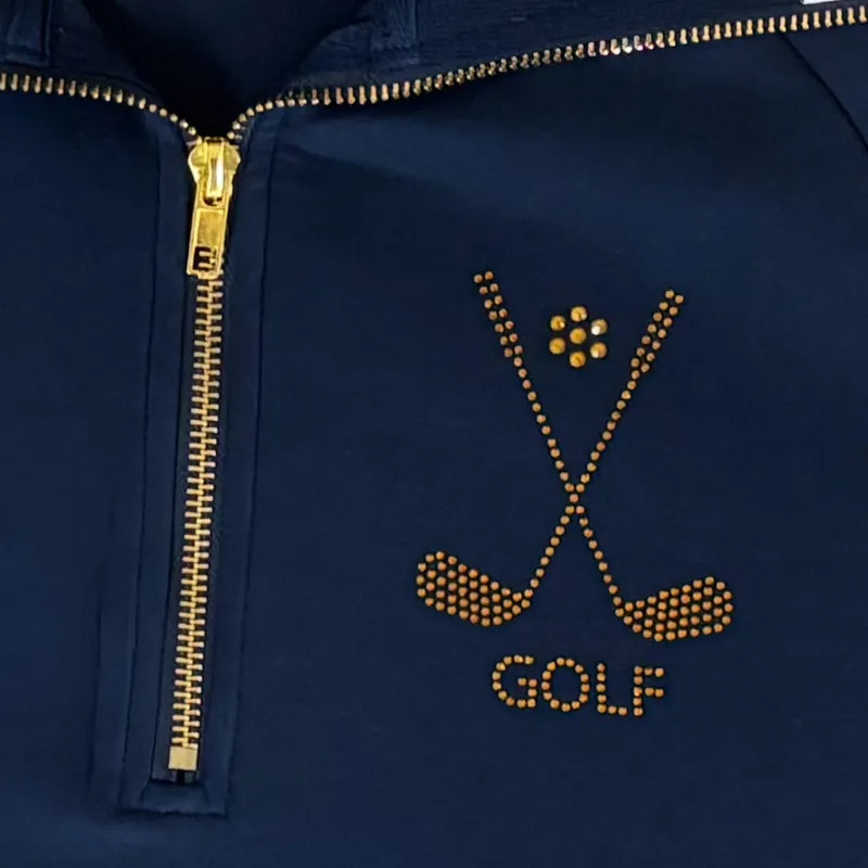 A touch of glamour shines through with Gold rhinestones spelling “GOLF” across the chest, offering a chic statement that turns heads on and off the course. Designed with functionality in mind, the sleeve features a 3-tee holder, keeping your essentials within easy reach. A fancy gold zipper adds a premium finish, completing the look with timeless elegance.