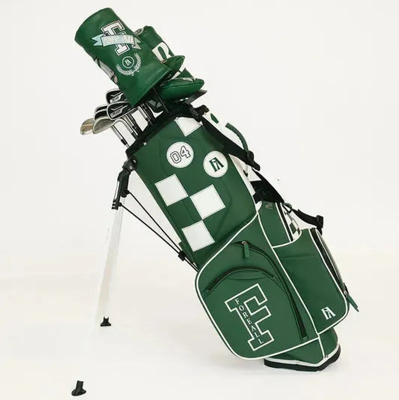 Crafted in signature green-and-cream textured vegan leather, this golf bag brings a retro collegiate aesthetic with a modern, functional twist. From custom embroidered patches to velvet-wrapped dividers, it’s where luxury meets playability — because you deserve a bag that works as hard (and looks as good) as you do.