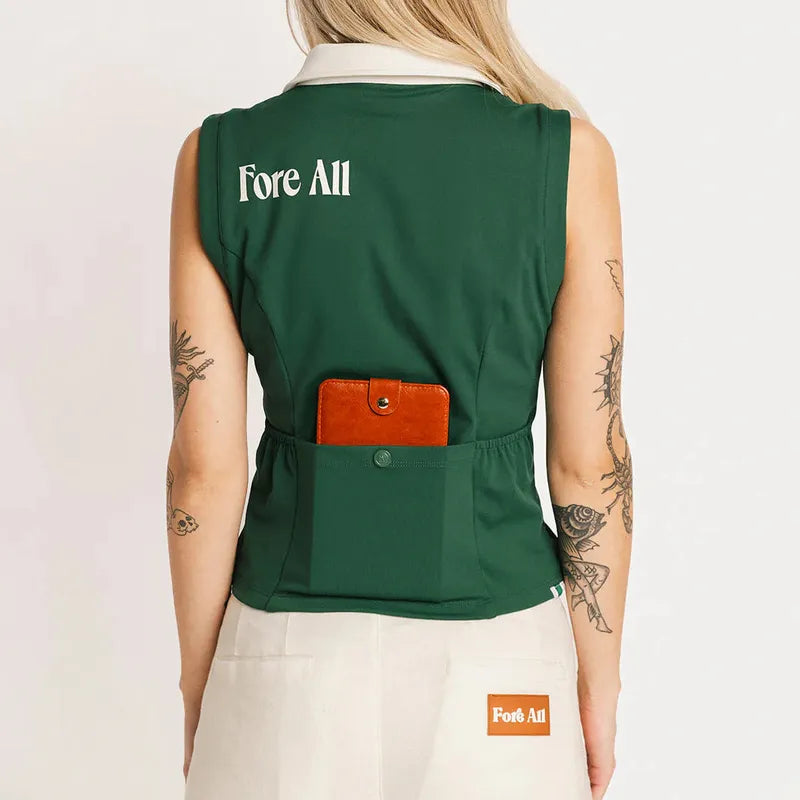 Designed with a classic sleeveless polo front and contrast collar, the real magic happens in the back. A utility-inspired design features two elasticated pockets plus one snap-closure pocket at the center back, giving you hands-free storage without compromising style. It's functional, intentional, and unmistakably Fore All.