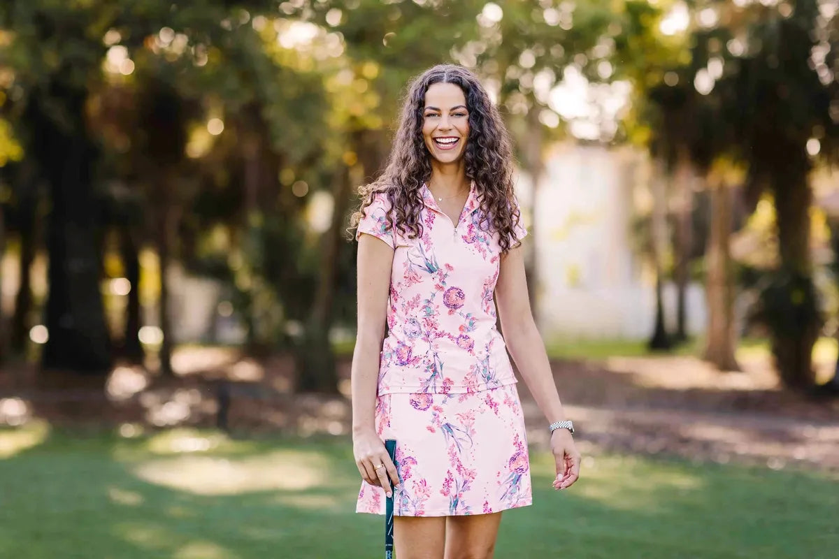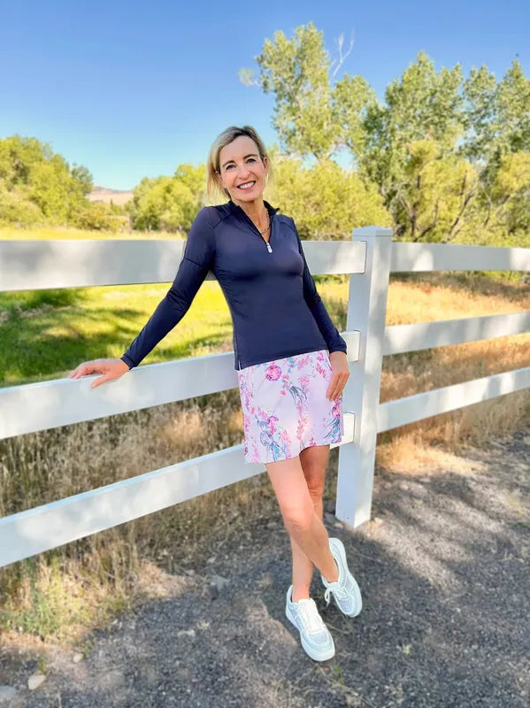 Beautiful shades of pink, blush, fuchsia and soft jade make this tea garden floral skort a stunner.  Super flattering slight A-line 17” silhouette with four zipper pockets and built in cozy shorts, UPF 50.