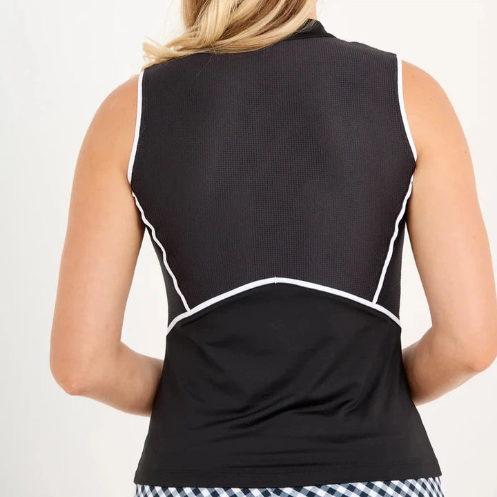 The Monochrome women's sleeveless top from Sofibella is a must-have for golf enthusiasts. Its curved design under the bust, contrast piping, and front zipper not only flatter the body, but also provide convenience. With strategically placed mesh inserts, this top ensures maximum cooling during hot days. This top is made with Sofibella's exclusive Sofi-Premier fabric, known for its UV protection, moisture-wicking, quick-drying, four-way stretch, and pilling resistance properties. Experience the ultimate performance with Sofibella Wear in this women's sleeveless golf top.